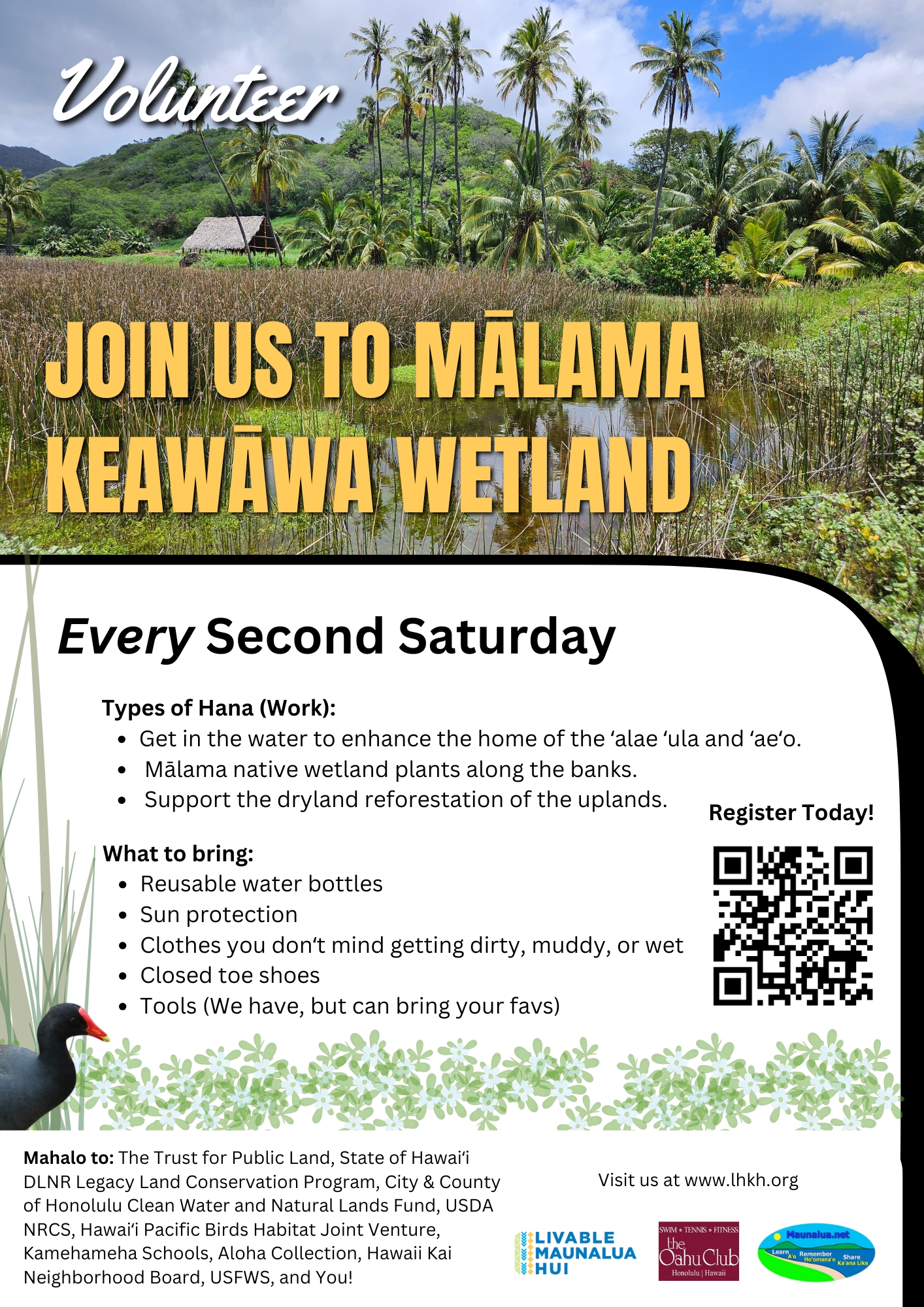 Need to balance out your hectic schedule? Connect with the ʻāina and join us! Second Saturdays focus on wetland enhancement for the ʻalaeʻula, the endangered waterbird endemic to only Oʻahu and Kauaʻi, and/or upland work tending to the dryland reforestation of Keawāwa.